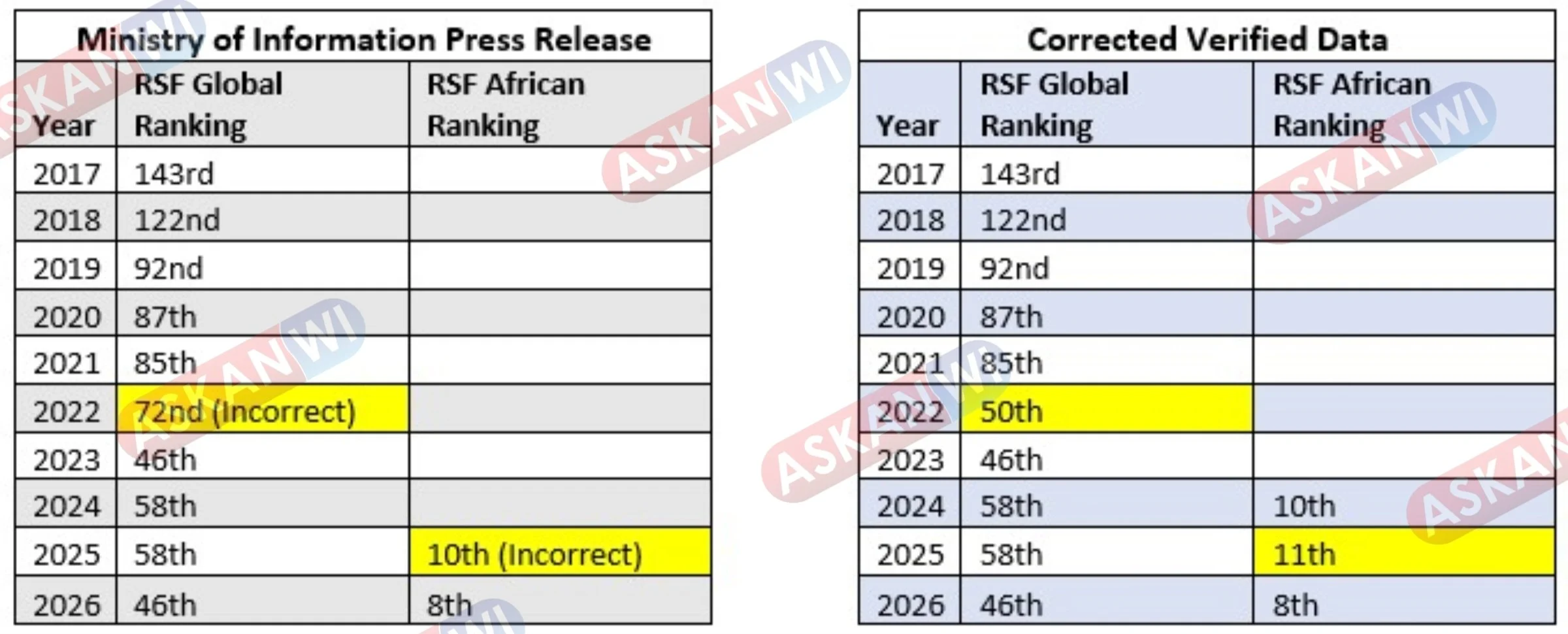 The Ministry of Information, Media and Broadcasting Services released a set of statistics on The Gambia’s press freedom rankings in a press statement earlier today. The data referenced is published annually by the Reporters Without Borders (RSF) and can be accessed online. However, a review by our newsroom has identified two inaccuracies in the data presented.